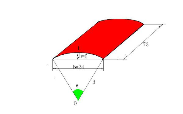 問:已知拱形屋頂長73米,寬24米,拱高5米,如下圖,求拱形屋面板攤開面積?